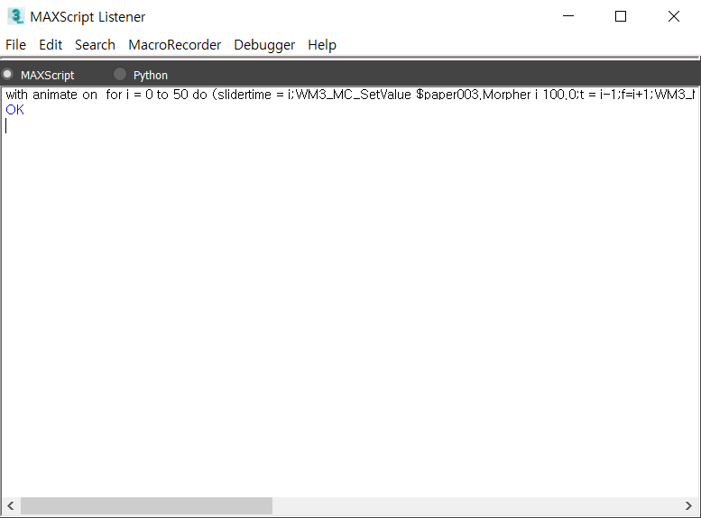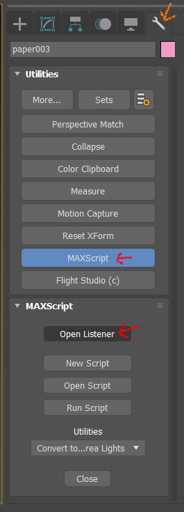 그 뒤 Utilities 탭에 가서(스패너 모양) MAX Script 버튼을 눌러준 후, Open Listener를 눌러서 리스너를 켜준다.
